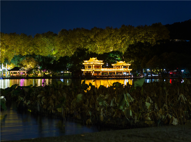 • 杭州夜色下西湖邊上建筑群燈光秀,夢(mèng)回唐朝